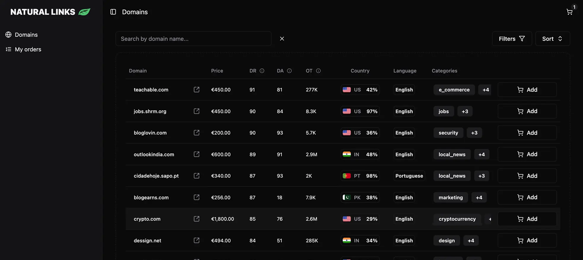 Filter by Domain Rating, traffic volume, geography, and language to match your campaign needs. Each publisher listing shows real performance data so you can spot the opportunities that will actually move your rankings.